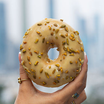 Artisan handcrafted ring doughnut glazed in Don Tulio espresso, finished with coffee-chocolate crumble and Here-O chocolate signature.